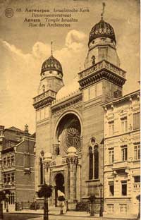 The above postcard depicts the synagogue in Liege. At the outbreak of World War II, the Jewish population in Liege was about 3,000. On the liberation of the city in September, 1944, there were 1,200 Jews left in the city. As of 1982, the Jewish population was about 1,000.