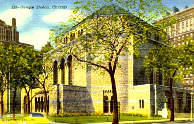 Jews first settled in the Chicago area in 1832. The big explosion in Jewish growth took place between 1880 and 1920, when the Jewish population grew from about 10,000 to 225,000. There are currently about 260,000 Jews in the Chicago metropolitan area, with about one-third in the city and two-thirds in the suburbs. The postcard below (postmarked 1951) depicts the Reform synagogue Temple Sholom, located on north Lake Shore Drive in Chicago.