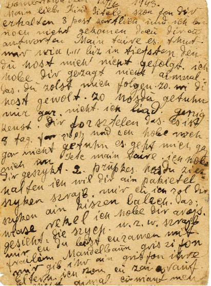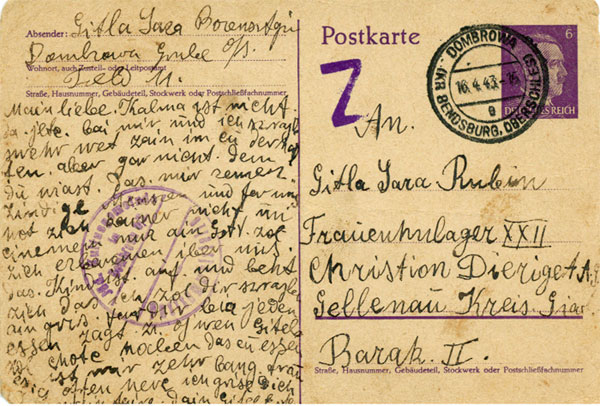Below are thumbnails of the front and back of a postcard sent by Gitla Borenstyn in Dombrowa Gornicza to Gitla Rubin who was in a Frauenlager (womens' camp) at Gellenau, a subcamp of Gross Rosen (see Gellenau). The card is potmarked April 16, 1943, and bears a violet Judenrat cachet, Jud. Kultusgemeinde in Dombrowa, on the front. Of unusual interest is the insertion of the Hebrew words "Yom Tov" in the 12th line of the message on the back of the card. This refers to the upcoming Passover holiday. This slipped by the censors, since only German was permitted. Please click on the thumbnail to see the full image, and then click your back key or "Postcard" in the left frame to return.