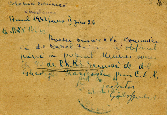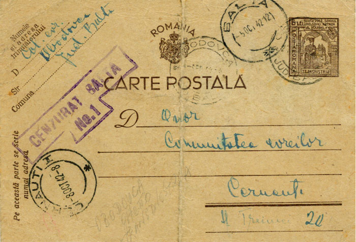 Below are thumbnails of the front and back of a postcard from the Jewish ghetto in Obodovka to the Jewish community in Chernovtsy, postmarked October 5, 1942, and received in Chernovtsy on October 8, 1942. Please click on the thumbnail to see the full image, and then click your back key or "Postcard" in the left frame to return.