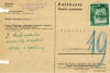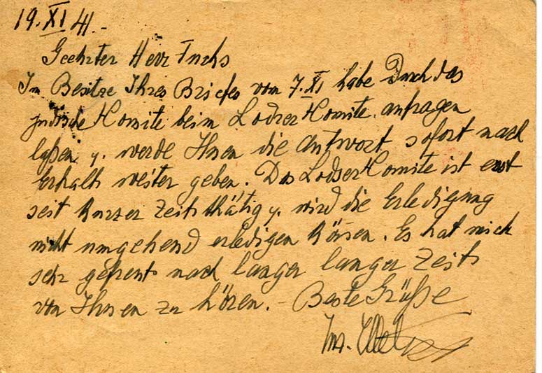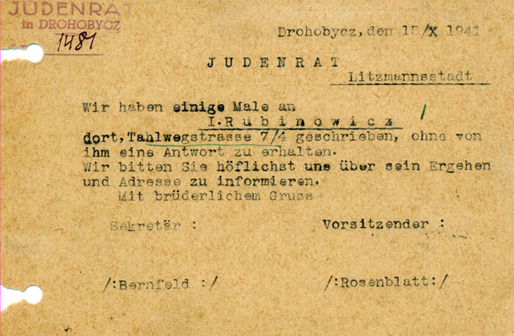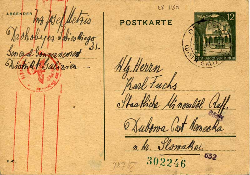 Below are thumbnails of the front and back of two postcards. The first is postmarked November 20, 1941, from Drohobycz to Slovakia. The second was sent by the Judenrat in Drohobycz to the Judenrat in the Lodz ghetto, postmarked October 17, 1941. This card bears a Judenrat cachet on front and back. The message in German inquires about I. Rubinowicz. There is a handwritten reply from the Lodz ghetto in green. Please click on the thumbnail to see the full image, and then click your back key or "Postcards" in the left frame to return.