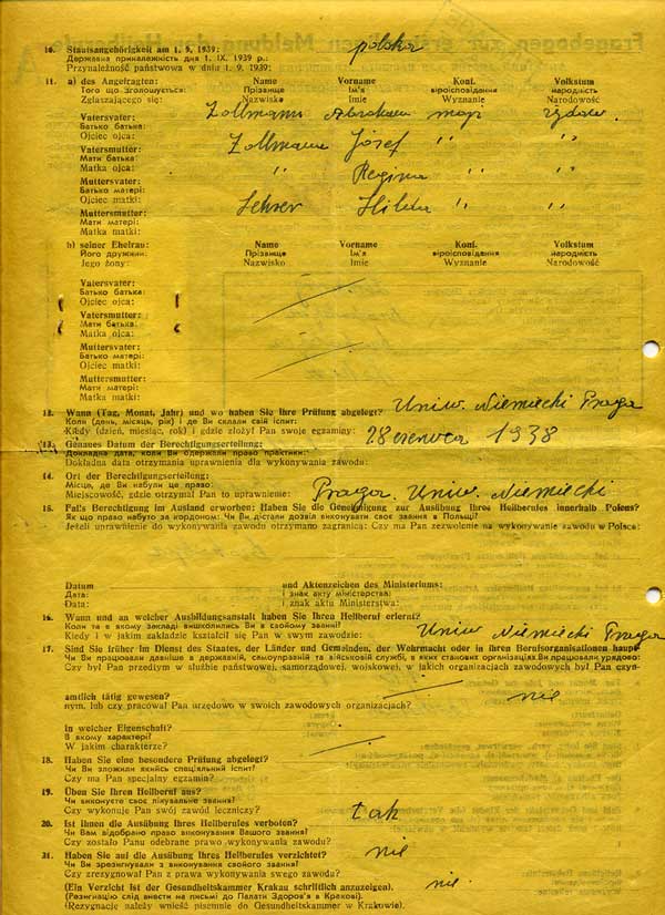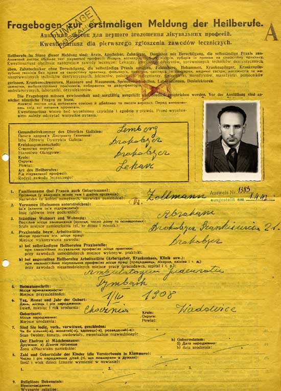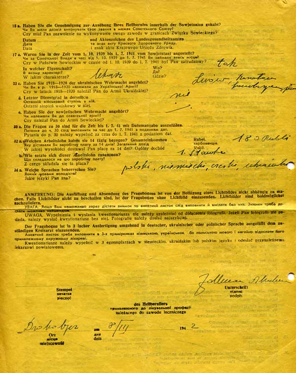 Below are thumbnails of an application form prepared by a Polish/Jewish doctor in Drohobycz. He was required to submit detailed information regarding his family and religious background. The form is signed by the doctor on the last page, and his photo is affixed to the first page with a stamp identifying him as a Jew. All medical professionals were required to complete these forms in order to continue practicing. Please click on the thumbnail to see the full image, and then click your back key or "Official Documents" in the left frame to return.