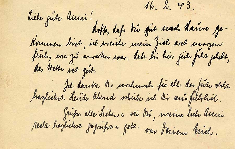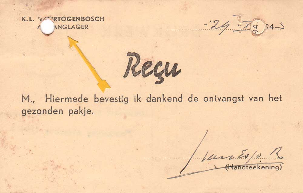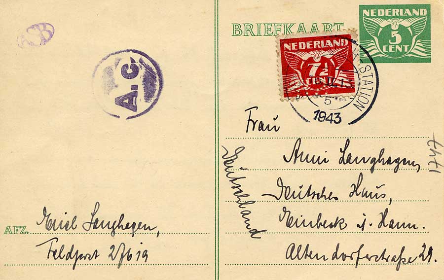 Below are thumbnails of the front and back of a postcard to Germany from "Feldpost". The card bears a 1943 "Herzogenbusch Station" postmark. Probably censored at Herzogenbusch. Please click on the thumbnail to see the full image, and then click your back key or "Postcard" in the left frame to return.
