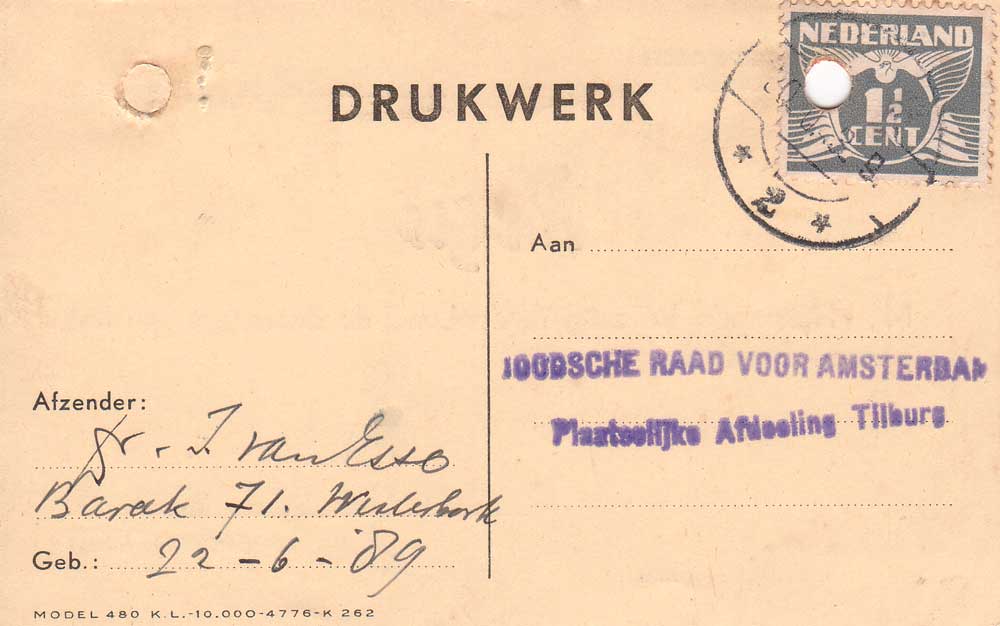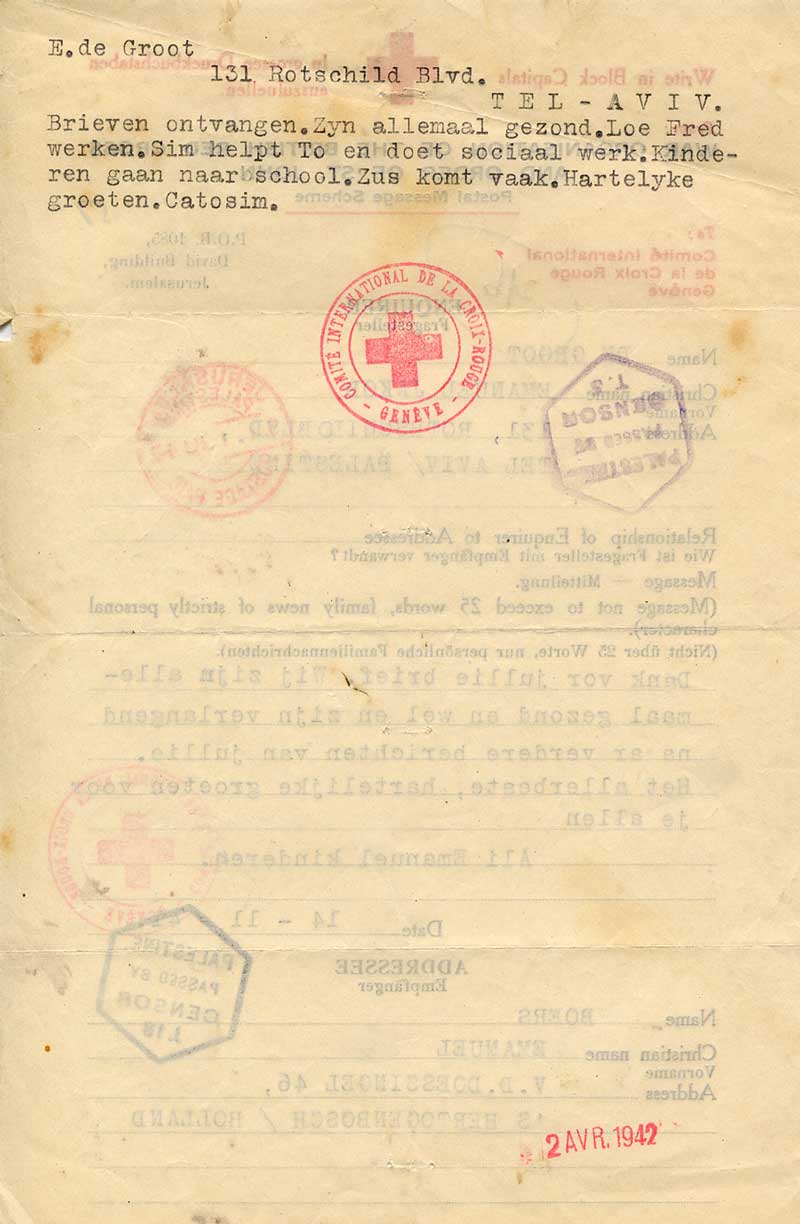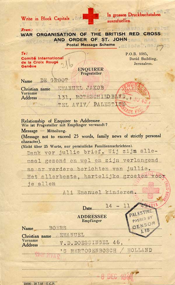 Below are thumbnails of the front and back of a Red Cross letter dated November 14, 1941, from a Dutch Jew in Tel Aviv to an inmate, Emanuel Boers, at Herzogenbusch. According to The Central Database of Shoah Victims' Names, he was transferred ultimately to Auschwitz where he died on November 19, 1943, Please click on the thumbnail to see the full image, and then click your back key or "Red Cross Letter" in the left frame to return.