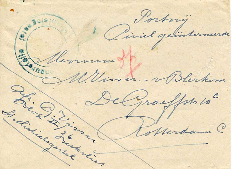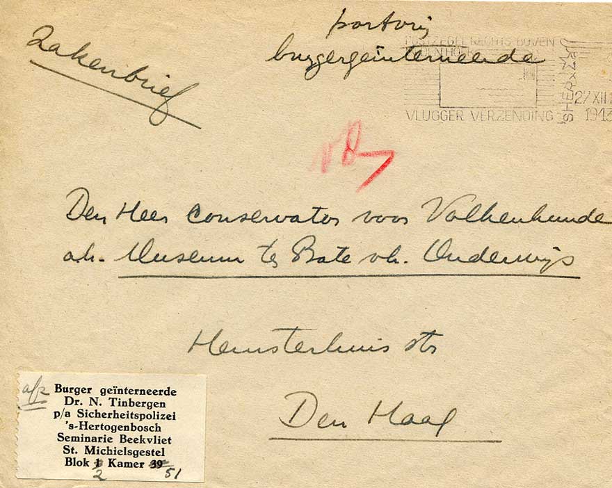 Below are thumbnails of three covers. The first is a cover postmarked July 24, 1943, from the Waffen SS office at Herzogenbusch. The second is a cover from a Dr. N. Tinbergen, an inmate at the Herzogenbusch work command at St. Michielsgestel postmarked December 27, 1943. The cover bears a sticker indicating that the cover was sent through the security-police. The third is a cover from an inmate at the Herzogenbusch work command at St. Michielsgestel. The cover bears a St. Michielsgestel censor cachet. Please click on the thumbnail to see the full image, and then click your back key or "Covers" in the left frame to return.
