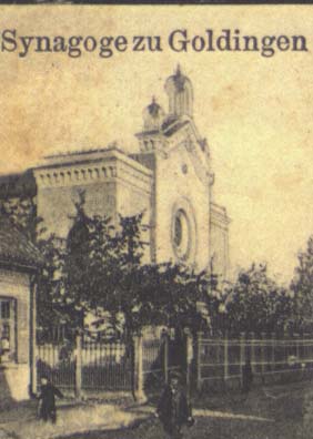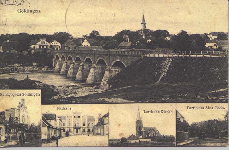 Kuldiga (Goldingen) is a town in western Latvia. The postcard reproduced below depicts the principal sights of Kuldiga, including the synagogue (lower left corner).
