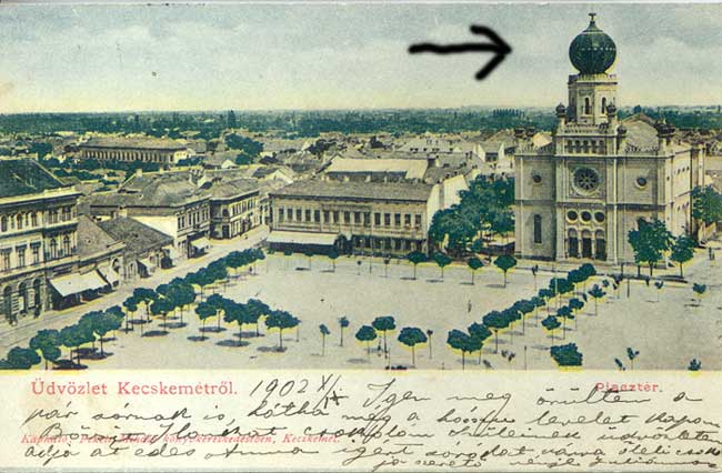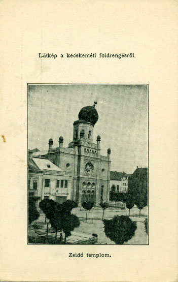 Kecskemet is a city in central Hungary. Jews first arrived in the city in the 16th century when the it was under Turkish rule. The Jewish population reached its peak around 1900 at 2,000 persons. By 1941, the number of Jews had fallen below 1,400. At the end of June, 1944, after the German occupation of Hungary, all the Jews were sent to Auschwitz, from which only 150 returned. The postcards below depict the synagogue in Kecskemet. The synagogue is now used as a church.