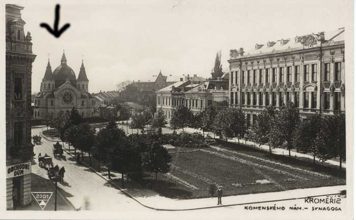 Kromeriz is a town in the Czech Republic on the Morava River, northeast of Brno. The Jewish community was one of the oldest in Europe, dating from 1322. In 1930, the Jewish community numbered 382 (about 12% of the total population). The Jews were deported in 1942, and the synagogue contents were sent the the Central Jewish Museum in Prague. The synagogue of Kromeriz is depicted in the postcard below.