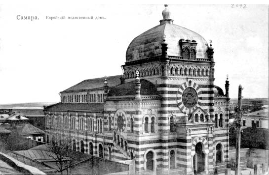 The postcard below depicts the great synagogue in Samara (now Kuibyshev), a city in Russia on the Volga River. Jews were not allowed to live in this area until the latter part of the 19th century. The pictured synagogue was built in 1908. By 1926, there were about 7,000 Jews in the city (about 4% of the total population). During World War II, many refugees from the German occupied regions settled in the city. In 1970, there was an estimated Jewish population of about 25,000.
