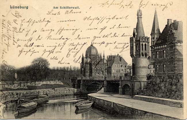 Luneburg is a city, Lower Saxony Land (state), north-central Germany, on the Ilmenau River at the northeastern edge of the Lüneburger Heide (heath). The synagogue was designed by Stadtbaumeister Kampf and built between 1892-94 in the north German Gothic manner. It appears that the use of local style and materials was to help the Jews integrate in a city where they had only recently been allowed to live. The postcard below, postmarked July 4, 1905, depicts the Luneburg synagogue.