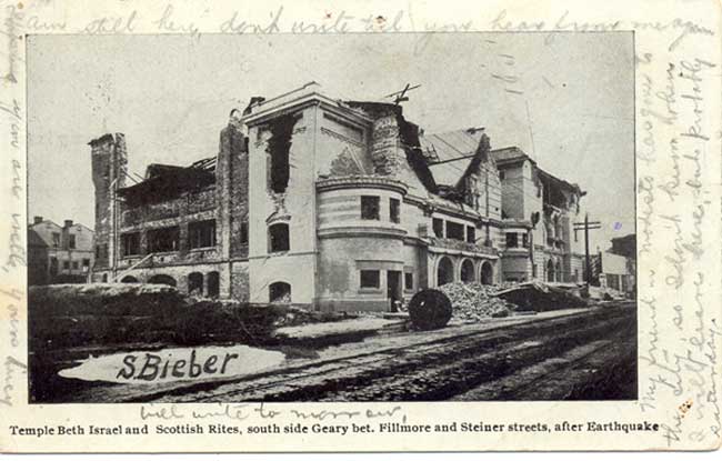 Although a small number of Jews arrived in San Francisco prior to 1849, a large number arrived during the gold rush of 1849-50. Two congregations were formed in 1850. As of 1990, there were about 90,000 Jews in San Francisco and another 130,000 in the surrounding areas. The postcard below depicts Temple Beth Israel after the earthquake in 1906. This card is postmarked June, 1906.