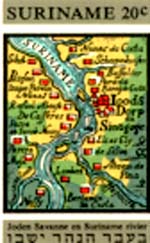 In 1968, Surinam issued three stamps to commemorate the establishment of the Jewish settlement in the country. The first stamp depicted below (20c value) features a map showing Jewish plantations on the Surinam River. The Hebrew inscription is from Joshua 24:2: "Your fathers dwelt on the other side of the flood in old time."