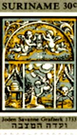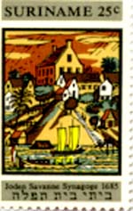 The second stamp depicted below (25c value) features the Joden Savanne Synagogue built in 1685 and destroyed by fire in 1832. The Hebrew inscription is from Isaiah 56:7: "Mine house shall be called a house of prayer."