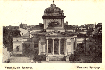 The postcard below (postmarked 1916) depicts the Tlomacka Street Synagogue in Warsaw. This synagogue, designed by Leandro Marconi, was consecrated in 1878. The community leaders who were the principal financial contributors were culturally assimilated and desired to build a large synagogue along classical lines associated with the Russian monarchy. The building was designed to seat 1,100. The synagogue, which was located outside the ghetto established by the Germans, was blown up on the orders of SS General Jurgen Stroop after the end of the ghetto uprising in 1943.
